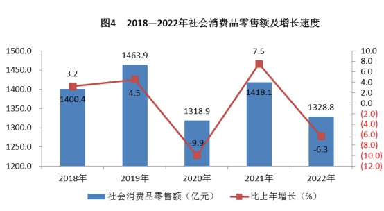 全年實(shí)現(xiàn)社會消費(fèi)品零售額1328.8億元,比上年下降6.3%,其中限額以上批發(fā)零售和住宿餐飲企業(yè)實(shí)現(xiàn)網(wǎng)上零售額425.2億元,增長3.3%。在限額以上批發(fā)和零售業(yè)中,汽車類實(shí)現(xiàn)零售額115.5億元,比上年下降20.9%;日用品類實(shí)現(xiàn)零售額43.7億元,增長92.6%;中西藥品類實(shí)現(xiàn)零售額23.5億元,增長12.9%。