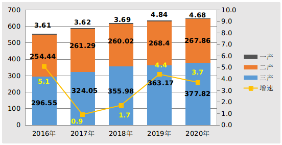 2020年,全區(qū)實現(xiàn)生產(chǎn)總值650.36億元,按可比價格計算,比上年增長3.7%,其中,第一產(chǎn)業(yè)增加值4.68億元,下降5.0%;第二產(chǎn)業(yè)增加值267.86億元,增長4.7%;第三產(chǎn)業(yè)增加值377.82億元,增長3.0%。三次產(chǎn)業(yè)結(jié)構(gòu)為0.7∶41.2∶58.1。