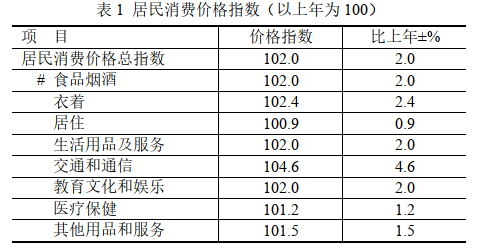 全年居民消費(fèi)價格指數(shù)(CPI)102.0,比上年上漲2.0%,其中消費(fèi)品價格指數(shù)102.6,上漲2.6%;服務(wù)項(xiàng)目價格指數(shù)101.2,上漲1.2%。分類別看,食品煙酒類上漲2.0%,衣著類上漲2.4%,居住類上漲0.9%,生活用品及服務(wù)類上漲2.0%,交通和通信類上漲4.6%,教育文化和娛樂類上漲2.0%,醫(yī)療保健類上漲1.2%;其他用品和服務(wù)類上漲1.5%。食品中,糧食上漲1.5%,食用油上漲7.5%,鮮菜上漲2.6%,蛋類上漲6.4%,干鮮瓜果上漲11.3%;水產(chǎn)品下跌3.9%,畜肉下跌2.3%。