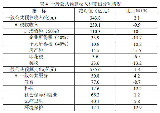 全年實(shí)現(xiàn)一般公共預(yù)算收入343.8億元,比上年增長2.1%,其中稅收收入239.1億元,下降9.9%;非稅收入104.7億元,增長46.4%。從主要稅種看,增值稅下降10.5%;企業(yè)所得稅下降13.7%,個人所得稅下降10.2%。全年實(shí)現(xiàn)一般公共預(yù)算支出535.6億元,下降1.4%,其中一般公共服務(wù)50.8億元,增長4.2%;教育支出77.0億元,下降8.7%;社會保障和就業(yè)支出66.2億元,增長1.2%;醫(yī)療衛(wèi)生支出40.1億元,增長5.8%。
