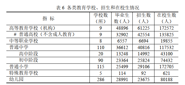 年末共有普通高校9所,本??普猩?.64萬人,在校學(xué)生11.71萬人,畢業(yè)生2.85萬人;研究生教育招生0.62萬人,在校生1.88萬人,畢業(yè)生0.44萬人;中等職業(yè)學(xué)校8所,在校學(xué)生1.99萬人;普通中學(xué)110所,在校學(xué)生11.75萬人,畢業(yè)生3.66萬人;小學(xué)115所,在校學(xué)生17.27萬人,畢業(yè)生2.55萬人。九年義務(wù)教育鞏固率100%,高中階段教育毛入學(xué)率100%。全市共有幼兒園286所,比上年增加2所,在園幼兒8.02萬人。