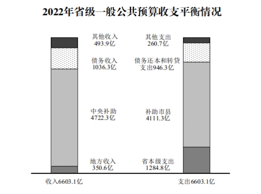 省級一般公共預(yù)算地方收入同口徑完成350.6億元,為調(diào)整預(yù)算的100.9%;加上中央補助4722.3億元,市縣上解247.7億元,一般債務(wù)收入1036.3億元,動用預(yù)算穩(wěn)定調(diào)節(jié)基金和調(diào)入資金85.1億元,上年結(jié)轉(zhuǎn)161.1億元,收入合計6603.1億元。省本級一般公共預(yù)算支出1284.8億元,加上上解中央61.3億元,補助市縣4111.3億元,一般債務(wù)還本116.1億元,轉(zhuǎn)貸市縣一般債務(wù)830.2億元,補充預(yù)算穩(wěn)定調(diào)節(jié)基金40億元,調(diào)出資金25億元,結(jié)轉(zhuǎn)下年134.4億元,支出合計6603.1億元,收支平衡。