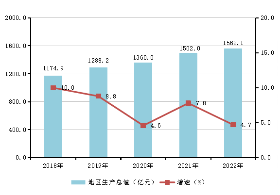 圖1 2018-2022年地區(qū)生產(chǎn)總值總量及其增長(zhǎng)速度