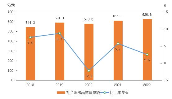 全年社會消費品零售總額實現(xiàn)626.6億元,比上年增長2.5%。按銷售單位所在地統(tǒng)計,城鎮(zhèn)市場零售額483.8億元,增長4.0%;鄉(xiāng)村市場零售額142.7億元,下降2.4%。