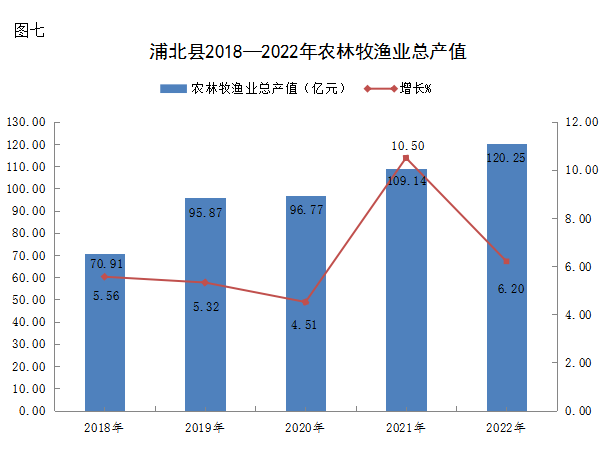 2022年全縣實(shí)現(xiàn)農(nóng)林牧漁業(yè)總產(chǎn)值120.25億元(按現(xiàn)行價(jià),下同),同比增長(zhǎng)6.2%(按上年價(jià),下同)。其中,農(nóng)業(yè)產(chǎn)值76.29億元,同比增長(zhǎng)7.1%;林業(yè)產(chǎn)值9.35億元,同比增長(zhǎng)4.85%;牧業(yè)產(chǎn)值24.78億元,同比增長(zhǎng)4.6%;漁業(yè)產(chǎn)值4.85億元,同比增長(zhǎng)3.1%;農(nóng)林牧漁服務(wù)業(yè)總產(chǎn)值4.97億元,增長(zhǎng)6.57%。