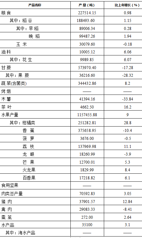 2022年油料產(chǎn)量1.005萬(wàn)噸,比上年增長(zhǎng)6.06%。甘蔗產(chǎn)量57.4萬(wàn)噸,下降17.28%。蔬菜產(chǎn)量(含食用菌) 34.44萬(wàn)噸,增長(zhǎng)8.2%。園林水果產(chǎn)量115.75萬(wàn)噸,增長(zhǎng)9%。