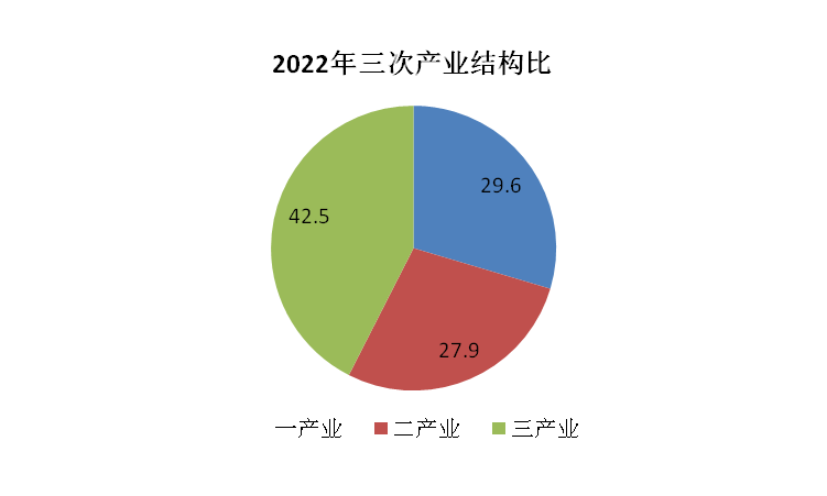 2022年全縣地區(qū)生產總值(GDP)312.97億元,按可比價格計算,同比增長1.9%。其中,第一產業(yè)增加值92.74億元,增長4.6%,對經濟增長的貢獻率為73.4%;第二產業(yè)增加值87.39億元,下降0.4%,對經濟增長的貢獻率為-6.2%;第三產業(yè)增加值132.84億元,增長1.4%,對經濟增長的貢獻率為32.8%。三次產業(yè)結構比29.6:27.9:42.5。