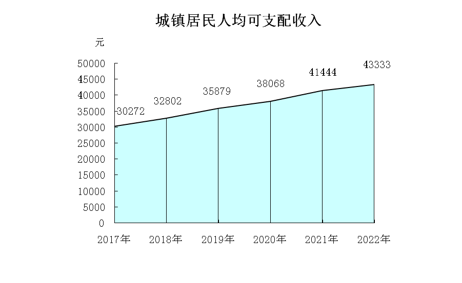 2022年城鎮(zhèn)居民人均可支配收入達到43333元,增長4.6%,人均生活消費支出為24861元,增長7.0%;農村居民人均可支配收入20659元,增長6.3%,人均生活消費支出15293元,增長4.5%。