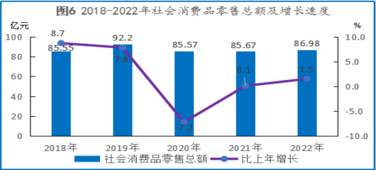 全年社會(huì)消費(fèi)品零售總額86.98億元,比上年增長(zhǎng)1.5%。