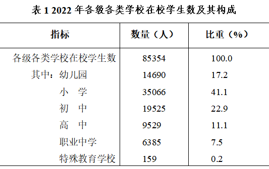 全年教育經(jīng)費(fèi)支出11.27億元,各級(jí)各類學(xué)校(不含幼兒園)97所,有專任教師6696人,在校學(xué)生7.07萬(wàn)人。年末幼兒園121所,在園幼兒人數(shù)1.47萬(wàn)人;小學(xué)65所,在校學(xué)生3.51萬(wàn)人,小學(xué)學(xué)齡兒童凈入學(xué)率100%;中學(xué)29所,在校學(xué)生2.91萬(wàn)人,初中學(xué)齡人口凈入學(xué)率100%,初中畢業(yè)生升學(xué)率94.2%,九年義務(wù)教育鞏固率95.4%,高中階段毛入學(xué)率91.5%,高中畢業(yè)生升學(xué)率76.0%;職業(yè)中學(xué)2所,在校學(xué)生6385人。