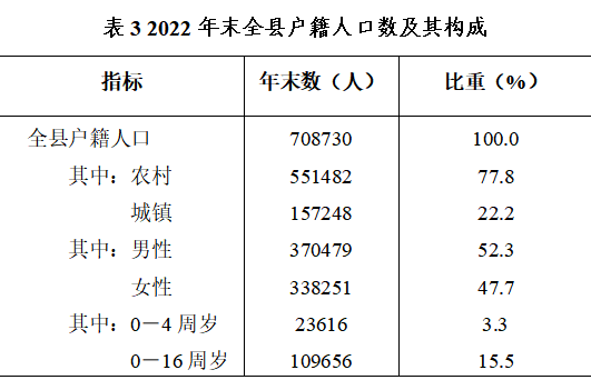 年末全縣戶籍總戶數(shù)25.29萬(wàn)戶。其中,農(nóng)業(yè)戶數(shù)15.76萬(wàn)戶。全縣戶籍人口70.87萬(wàn)人。其中,農(nóng)村戶籍人口55.15萬(wàn)人,城鎮(zhèn)戶籍人口15.72萬(wàn)人,少數(shù)民族戶籍人口849人。全縣常住人口50.8萬(wàn)人。其中,城鎮(zhèn)常住人口20.46萬(wàn)人,常住人口城鎮(zhèn)化率提高到40.27%。當(dāng)年人口出生率9.84‰,出生人口性別比108.8(以女孩為100),人口死亡率10.43‰,人口自然增長(zhǎng)率-0.59‰,人口符合政策生育率100.0%。
