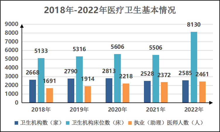 全年醫(yī)療機(jī)構(gòu)總診療人次344.76萬人次。其中,醫(yī)院197.62萬人次(民營(yíng)醫(yī)院3.89萬人次);基層醫(yī)療機(jī)構(gòu)129.46萬人次;出院10.61萬人。其中,醫(yī)院10.23萬人(民營(yíng)醫(yī)院0.62萬人);基層醫(yī)療機(jī)構(gòu)0.28萬人。