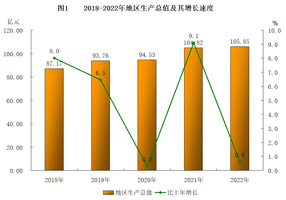 根據(jù)地區(qū)生產(chǎn)總值統(tǒng)一核算結(jié)果,全年實(shí)現(xiàn)地區(qū)生產(chǎn)總值105.85億元,按可比價(jià)格計(jì)算,同比增長0.6%。其中,第一產(chǎn)業(yè)增加值13.66億元,增長3.4%;第二產(chǎn)業(yè)增加值44.65億元,增長1.0%;第三產(chǎn)業(yè)增加值47.54億元,下降0.7%。第一產(chǎn)業(yè)增加值占地區(qū)生產(chǎn)總值比重為12.9%,與上年持平;第二產(chǎn)業(yè)增加值比重為42.2%,比上年提高0.3個(gè)百分點(diǎn);第三產(chǎn)業(yè)增加值比重為44.9%,比上年下降0.3個(gè)百分點(diǎn)。人均地區(qū)生產(chǎn)總值71569元,比上年增長1.8%。