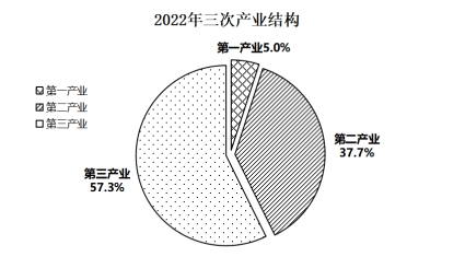 生產(chǎn)總值中,第一、第二和第三產(chǎn)業(yè)增加值占比分別為5.0%、37.7%和57.3%。與上年相比,第一產(chǎn)業(yè)、第三產(chǎn)業(yè)占比分別提高了0.3、0.1個(gè)百分點(diǎn),第二產(chǎn)業(yè)占比下降了0.4個(gè)百分點(diǎn)。