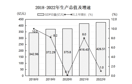 初步核算,全年實(shí)現(xiàn)生產(chǎn)總值(簡稱GDP)426.51億元,比上年增長1.0%。其中,第一產(chǎn)業(yè)增加值21.17億元,同比增長4.0%;第二產(chǎn)業(yè)增加值160.98億元,同比增長1.5%;第三產(chǎn)業(yè)增加值244.36億元,同比增長0.5%;人均生產(chǎn)總值68671元,比上年增長0.7%。