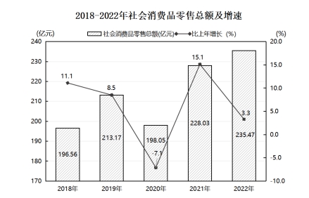實(shí)現(xiàn)社會(huì)消費(fèi)品零售總額235.47億元,同比增長3.3%。從企業(yè)經(jīng)營地看,城鎮(zhèn)消費(fèi)品零售額218.98億元,同比增長3.0%;鄉(xiāng)村消費(fèi)品零售額16.49億元,同比增長6.3%。從消費(fèi)形態(tài)看,餐飲收入25.45億元,同比增長0.1%;商品零售210.02億元,同比增長3.7%。