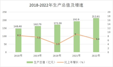 地區(qū)生產(chǎn)總值中,第一產(chǎn)業(yè)增加值占生產(chǎn)總值的比重為19.3%,較2021年下降0.4個(gè)百分點(diǎn);第二產(chǎn)業(yè)增加值占生產(chǎn)總值的比重為47.8%,較2021年提高1.7個(gè)百分點(diǎn);第三產(chǎn)業(yè)增加值占生產(chǎn)總值的比重為32.9%,較2021年下降1.3個(gè)百分點(diǎn)。