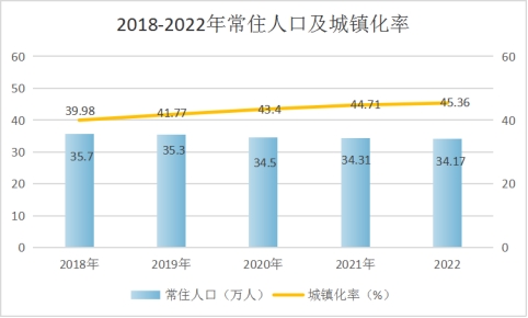 常住人口34.17萬(wàn)人,出生率為7.67‰,死亡率為8.25‰,自然增長(zhǎng)率為-0.58‰,常住人口城鎮(zhèn)化率為45.36%。