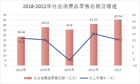 2022年全年實(shí)現(xiàn)社會(huì)消費(fèi)品零售總額45.54億元,同比增長(zhǎng)10.5%。其中,限額以上單位實(shí)現(xiàn)消費(fèi)品零售總額15.47億元,同比增長(zhǎng)12.4%。按經(jīng)營(yíng)單位所在地分,城鎮(zhèn)消費(fèi)品零售額33.32億元,增長(zhǎng)9.5%;鄉(xiāng)村消費(fèi)品零售額12.22億元,增長(zhǎng)13.3%。按消費(fèi)形態(tài)分,商品零售38.81億元,增長(zhǎng)10.9%;餐飲收入6.73億元,增長(zhǎng)8.3%。