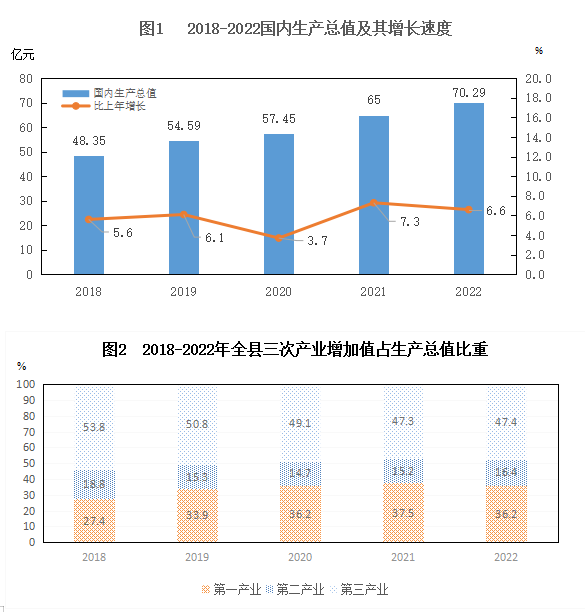 初步核算,實(shí)現(xiàn)生產(chǎn)總值70.29億元,比上年增長6.6%。其中一產(chǎn)增加值25.46億元,增長6.5%;二產(chǎn)增加值11.5億元,增長9.4%;三產(chǎn)增加值33.33億元,增長5.8%。三次產(chǎn)業(yè)結(jié)構(gòu)比由上年的37.5:15.2:47.3調(diào)整為36.2:16.4:47.4,與上年相比,第一產(chǎn)業(yè)下降1.3個(gè)百分點(diǎn),第二產(chǎn)業(yè)上升1.2個(gè)百分點(diǎn),第三產(chǎn)業(yè)上升0.1個(gè)百分點(diǎn)。按常住人口計(jì)算,人均生產(chǎn)總值61659元,增長7.6%。十大生態(tài)產(chǎn)業(yè)完成增加值29.64億元,占地區(qū)生產(chǎn)總值比重為42.2%,比重比上年提升2.3個(gè)百分點(diǎn)。