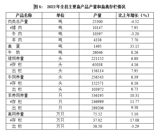畜牧業(yè):全縣人工種草面積達(dá)17.7萬畝,落實(shí)草原禁牧面積73.63萬畝,草原植被覆蓋度達(dá)24.2%,秸稈飼料化利用率達(dá)85%以上。累計(jì)建成標(biāo)準(zhǔn)化養(yǎng)殖場(區(qū))159個(gè),其中:肉牛養(yǎng)殖場區(qū)86個(gè),奶牛養(yǎng)殖場(區(qū))6個(gè),生豬養(yǎng)殖場(區(qū))40個(gè),其他養(yǎng)殖小區(qū)13個(gè)。年末大牲畜存欄16.08萬頭(匹),增長7.06%,出欄10.51萬頭(匹),下降3.04%,其中牛存欄15.26萬頭,增長6.16%,出欄10.4萬頭,增長6.73%。豬存欄6.5萬頭,增長4.16%,出欄15.61萬頭,增長7.95%。羊存欄24.7萬只,增長11.77%,出欄28.92萬只,增長9.38%。家禽存欄37.02萬只,增長17.08%,出欄38.5萬只,下降3.29%。全年肉類總產(chǎn)量2.53萬噸,下降4.52%;禽蛋產(chǎn)量0.15萬噸,增長35.15%;牛奶產(chǎn)量2.6噸,增長8.26%。