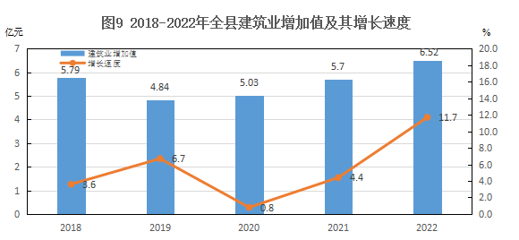 建筑業(yè):全年建筑業(yè)增加值6.52億元,增長11.7%。年末具有資質(zhì)的總承包建筑業(yè)企業(yè)34戶,比上年末增加4戶。城區(qū)新建商住樓5棟3.6萬平方米,其中住宅160套2.85萬平方米;城區(qū)棚戶區(qū)改造新建安置房3棟168套1.88萬平方米;老舊樓小區(qū)改造2589套。