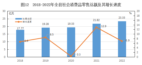 全縣實(shí)現(xiàn)社會(huì)消費(fèi)品零售總額23.33億元,增長6.9%。按經(jīng)營地統(tǒng)計(jì),城鎮(zhèn)消費(fèi)品零售額14.72億元,增長7.3%,鄉(xiāng)村消費(fèi)品零售額8.61億元,增長6.3%。按消費(fèi)形態(tài)統(tǒng)計(jì),商品零售21.74億元,增長7.1%;餐飲收入1.59億元,增長4.7%。
