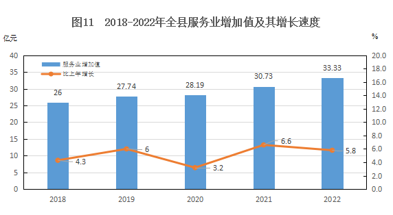 全年實(shí)現(xiàn)服務(wù)業(yè)增加值33.33億元,增長5.8%。其中批發(fā)零售業(yè)增加值4.31億元,增長2.6%;交通運(yùn)輸業(yè)增加值3.84億元,增長17.9%;住宿和餐飲業(yè)增加值1.01億元,下降1.0%;金融業(yè)增加值5.37億元,增長5.3%;房地產(chǎn)業(yè)增加值1.97億元,增長4.3%;營利性服務(wù)業(yè)增加值3.02億元,增長3.3%;非營利性服務(wù)業(yè)增加值11.72億元,增長4.3%。