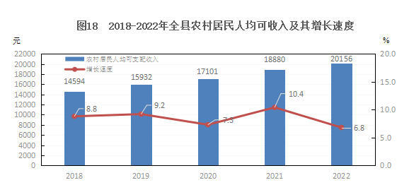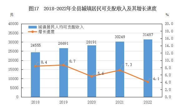 居民收入和消費(fèi):全縣城鎮(zhèn)居民人均可支配收入31486.7元,增加1237.3元,增長4.1%。農(nóng)村居民人均可支配收入20156.2元,增加1276.4元,增長6.8%。城鎮(zhèn)居民人均生活消費(fèi)支出22286.1元,增加828.8元,增長3.9%;農(nóng)村居民人均生活消費(fèi)支出16583.3元,增加995.8元,增長6.4%。城鎮(zhèn)居民恩格爾系數(shù)為31%,提高1個(gè)百分點(diǎn);農(nóng)村居民恩格爾系數(shù)為28.3%,下降1.6個(gè)百分點(diǎn)。
