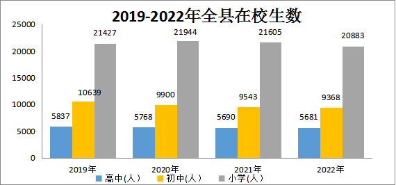 年末全縣學(xué)校總數(shù)154所,教職工3856人。其中,專任教師3542人。在校學(xué)生數(shù)46767人,其中:小學(xué)在校學(xué)生20883人、初中生9368人、高中生5681人、幼兒園9621人。全縣小學(xué)招生3330人,初中招生3315人,普通高中招生1807人。全縣有職業(yè)中等??茖W(xué)校1所,教職工99人,在校學(xué)生1214人。