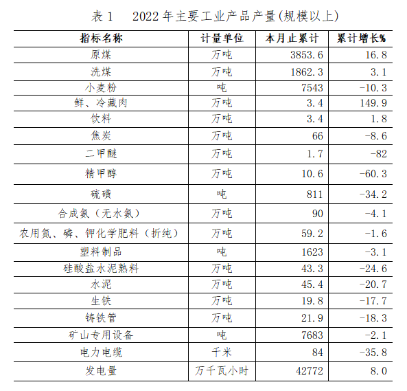 全年規(guī)模以上工業(yè)企業(yè)原煤產(chǎn)量3853.6萬噸,增長16.8%;洗煤1862.3萬噸,增長3.1%(全社會(huì)洗煤產(chǎn)量897.0萬噸,下降0.4%);氮肥(折含N100%)59.2萬噸,下降1.6%;水泥45.4萬噸,下降20.7%;生鐵19.8萬噸,下降17.7%;焦炭66萬噸,下降8.6%。