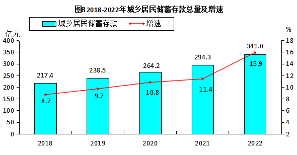 年末全市金融部門本外幣各項(xiàng)存款余額454.2億元,較年初增加61.8億元,增長15.7%,其中住戶存款年末余額341.0億元,較年初增加46.7億元,增長15.9%。各項(xiàng)貸款余額222.5億元,較年初增長37.0億元,增長20.0%。