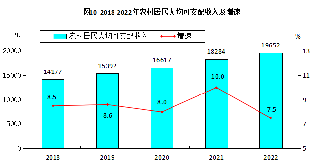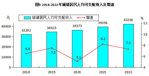 2022年,我市居民人均可支配收入為30977元,增長7.4%。按常住地分,城鎮(zhèn)常住居民人均可支配收入42236元,增長7.3%;農(nóng)村常住居民人均可支配收入19652元,增長7.5%。城鎮(zhèn)居民家庭恩格爾系數(shù)(即居民家庭食品消費(fèi)支出占家庭消費(fèi)支出的比重)25.4%,農(nóng)村居民家庭恩格爾系數(shù)27.1%。