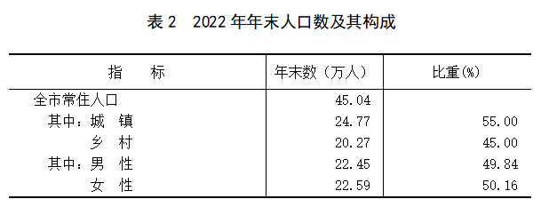 據(jù)2022年人口抽樣調(diào)查,年末全市常住人口為450411人,比上年末減少356人。全年全市出生人口2917人,人口出生率為6.47‰;死亡人口4474人,死亡率為9.93‰;自然增長率為-3.46‰。性別比為99.34(以女性人口為100)。