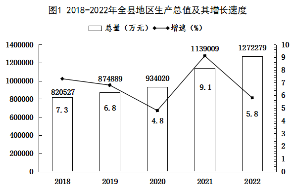 初步核算,全年全縣地區(qū)生產(chǎn)總值(GDP)1272279萬元,按可比價計算,增長5.8%。其中,第一產(chǎn)業(yè)增加值192301萬元,增長5.8%;第二產(chǎn)業(yè)增加值534930萬元,增長8.6%;第三產(chǎn)業(yè)增加值545048萬元,增長3.8%。第三產(chǎn)業(yè)中,批發(fā)和零售業(yè)93386萬元,增長1.1%;交通運(yùn)輸、倉儲和郵政業(yè)64822萬元,下降1.8%;住宿和餐飲業(yè)6657萬元,增長2.1%;金融業(yè)47999萬元,增長9.8%;房地產(chǎn)業(yè)79328萬元,增長0.2%;營利性服務(wù)業(yè)57494萬元,增長3.7%;非營利性服務(wù)業(yè)185966萬元,增長7.4%。三次產(chǎn)業(yè)增加值的構(gòu)成為15.1:42.1:42.8,對經(jīng)濟(jì)增長的貢獻(xiàn)率分別為17.8%、50.6%、31.6%,依次拉動經(jīng)濟(jì)增長點(diǎn)數(shù)分別為1.0、3.0、1.8個百分點(diǎn)。地區(qū)生產(chǎn)總值分季度看,一季度增長6.5%,二季度增長3.3%,三季度增長6.0%,四季度增長5.8%。全年人均地區(qū)生產(chǎn)總值達(dá)到41193元,比上年增長7.2%。