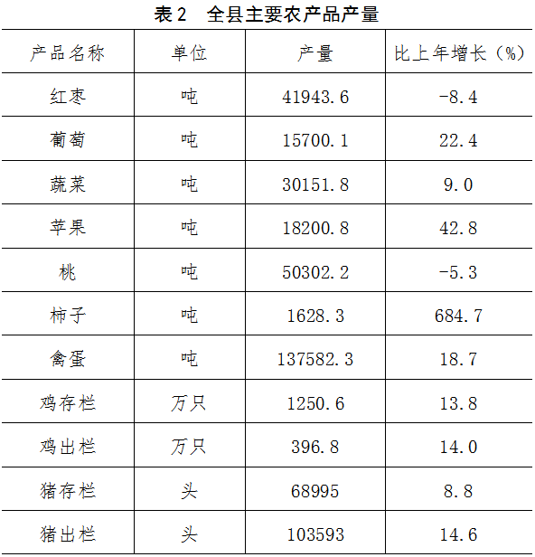 全年全縣農(nóng)作物播種面積704605.12畝,下降4.5%。全年糧食種植面積692009.02畝,增長0.08%。其中,夏糧種植面積371997.23畝,下降0.3%;秋糧種植面積320011.79畝,增長0.5%。全年油料種植面積1719.5畝,增長5.5%。全年果園種植面積75930.8畝,增長3.0%。其中,紅棗種植面積43935.8畝,下降0.7%;葡萄種植面積5436畝,增長7.3%;蘋果種植面積5827畝,下降5.4%;桃種植面積17811畝,增長0.1%。全年蔬菜種植面積10876.6畝,增長12.9%。