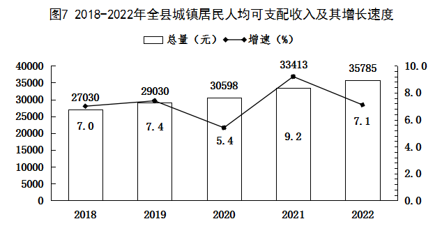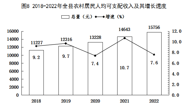 全年全縣居民人均可支配收入22998元,增長7.6%。按常住地分,城鎮(zhèn)常住居民人均可支配收入35785元,增長7.1%;農(nóng)村常住居民人均可支配收入15756元,增長7.6%。