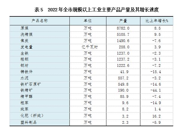 全年全市規(guī)模以上原煤產(chǎn)量8782.0萬噸,比上年增長8.5%;焦炭產(chǎn)量1490.6萬噸,下降7.6%;發(fā)電量258.0億千瓦時(shí),增長3.9%;非常規(guī)天然氣產(chǎn)量18.5億立方米,下降1.0%。