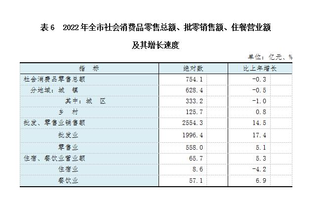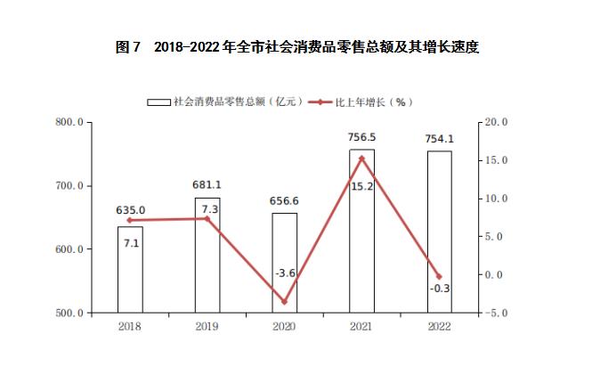 全年全市社會消費(fèi)品零售總額754.1億元,比上年下降0.3%。按經(jīng)營地統(tǒng)計(jì),城鎮(zhèn)消費(fèi)品零售額628.4億元,下降0.5%;鄉(xiāng)村消費(fèi)品零售額125.7億元,增長0.8%。按消費(fèi)形態(tài)統(tǒng)計(jì),商品零售額676.6億元,下降0.6 %;餐飲收入額77.5億元,增長2.1%。