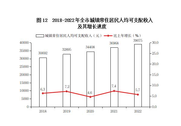 全年全市居民人均可支配收入27375元,比上年增長6.5%。其中,城鎮(zhèn)常住居民人均可支配收入39075元,增長5.7%;農(nóng)村常住居民人均可支配收入16334元,增長6.8%。居民人均消費(fèi)支出14042元,比上年增長1.6%。其中,城鎮(zhèn)居民人均消費(fèi)支出17783元,下降0.9%;農(nóng)村居民人均消費(fèi)支出11994元,增長6.2%。