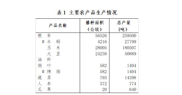 全年農(nóng)作物總播種面積59331公頃,比上年增長0.2%,其中糧食作物播種面積56526公頃,增長0.3%。糧食總產(chǎn)量259500噸,增長2.7%。其中,水稻產(chǎn)量27799噸,減產(chǎn)17.8%,單產(chǎn)6594公斤/公頃,下降0.6%;玉米產(chǎn)量180507噸,減產(chǎn)0.1%,單產(chǎn)6446公斤/公頃,增長9.3%;大豆產(chǎn)量50889噸,增產(chǎn)34.5%,單產(chǎn)2100公斤/公頃,增長11.0%。