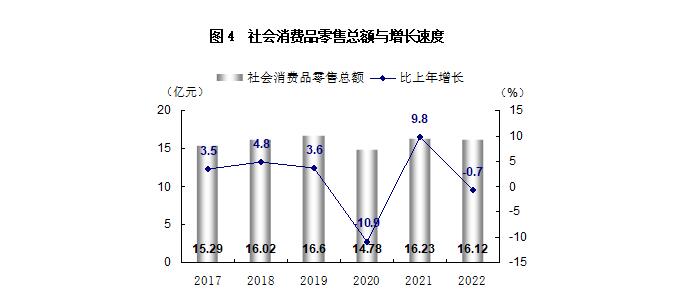 全年社會消費品零售總額161220萬元,比上年下降0.7%。分行業(yè)看,批發(fā)和零售業(yè)零售額144935萬元,下降1.0%;住宿和餐飲業(yè)零售額16285萬元,增長2.8%。分城鄉(xiāng)看,城鎮(zhèn)消費品零售額142173萬元,下降1.4%;鄉(xiāng)村消費品零售額19047萬元,增長5.0%。