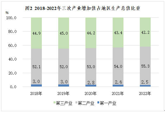 經(jīng)初步核算,全年實(shí)現(xiàn)地區(qū)生產(chǎn)總值3000.55億元,按不變價(jià)格計(jì)算,同比增長(zhǎng)2.1%。其中,第一產(chǎn)業(yè)增加值74.69億元,同比增長(zhǎng)3.2%;第二產(chǎn)業(yè)增加值1659.79億元,同比增長(zhǎng)5.2%;第三產(chǎn)業(yè)增加值1266.07億元,同比下降1.7%。三次產(chǎn)業(yè)增加值比例調(diào)整為2.5:55.3:42.2。