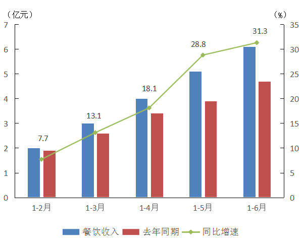 上半年,全區(qū)實現(xiàn)餐飲收入6.1億元,同比增長31.3%,對全區(qū)社會消費品零售總額增長的貢獻率為44.8%。其中,限額以上住宿和餐飲業(yè)累計實現(xiàn)餐飲收入2.2億元,增長26.9%,增速比一季度加快14.2個百分點。