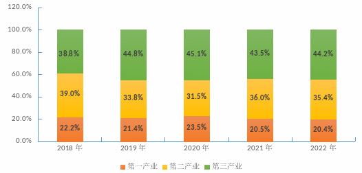 圖2 2018年—2022年三次產(chǎn)業(yè)增加值占地區(qū)生產(chǎn)總值比重