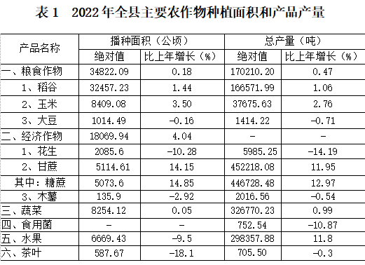 農(nóng)作物產(chǎn)品產(chǎn)量:全年糧食總產(chǎn)量170210 噸,比上年增加796噸,增長(zhǎng)0.47%。其中,夏糧產(chǎn)量84588噸,減產(chǎn)399噸;早稻產(chǎn)量64618噸,增產(chǎn)695噸;秋糧產(chǎn)量85517噸,增產(chǎn)1229噸。全年谷物產(chǎn)量166572?噸,增產(chǎn)1744噸,其中,稻谷產(chǎn)量128894噸,增產(chǎn)2856噸;玉米產(chǎn)量37676噸,減產(chǎn)1071噸。油料產(chǎn)量 6446噸,減產(chǎn)886噸;甘蔗產(chǎn)量452218噸,增產(chǎn)48259噸;蔬菜產(chǎn)量(含食用菌)326770噸,增產(chǎn)3212噸;園林水果產(chǎn)量298358噸,增產(chǎn)31569噸。(見(jiàn)表1)