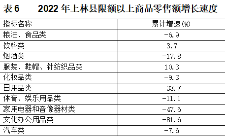 分行業(yè)限額以上商品零售額增長(zhǎng)速度(見(jiàn)表6)