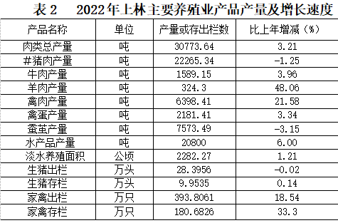 養(yǎng)殖業(yè)產(chǎn)品產(chǎn)量:全年肉類總產(chǎn)量達(dá)?22265?噸,比上年增長(zhǎng)3.21%,其中,豬肉產(chǎn)量?22265噸,下降1.25%;牛肉產(chǎn)量1589噸,增長(zhǎng)3.96%;全年生豬出欄?28.4萬(wàn)頭,下降0.02%;生豬年末存欄9.95萬(wàn)頭,增長(zhǎng)0.14%;家禽出欄?393.81萬(wàn)只,增長(zhǎng)18.54%;家禽存欄180.68萬(wàn)只,增長(zhǎng)33.3%;禽蛋產(chǎn)量?2181噸,增長(zhǎng)3.3%;水產(chǎn)品總產(chǎn)量達(dá)到20800噸,增長(zhǎng)6%。(見(jiàn)表2)