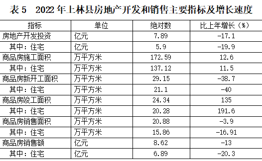 全年房地產(chǎn)開(kāi)發(fā)共25個(gè)項(xiàng)目,比上年增加?1個(gè)。全縣房地產(chǎn)開(kāi)發(fā)投資7.89億元,比上年下降17.1%。商品房屋施工面積172.59萬(wàn)平方米,比上年增長(zhǎng)12.6%;其中本年新開(kāi)工面積29.15萬(wàn)平方米,比上年下降38.7%;商品房銷售面積20.88萬(wàn)平方米,比上年下降3.9%;商品房銷售額8.62億元,比上年下降13%。(見(jiàn)表5)