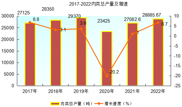 全年肉類總產(chǎn)量28885.67噸,比上年增長6.7%。其中:豬肉產(chǎn)量23044噸,增長7.1%;牛肉產(chǎn)量1888噸,增長13.9%;羊肉產(chǎn)量471噸,下降0.8%。禽蛋產(chǎn)量1232噸,增長3.4%。大牲畜年末存欄61276頭,增長1.5%;生豬存欄215830頭,增長0.6%;羊存欄38811只,下降1.0%。
